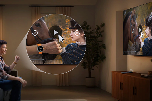 Ελέγξτε εύκολα την τηλεόρασή σας με το συμβατό smartwatch σας. Φορέστε το συμβατό Galaxy Watch σας και χρησιμοποιήστε χειρονομίες, όπως το τσίμπημα, για να κάνετε μια επιλογή ή μετακινήστε τον καρπό σας μπρος-πίσω για παύση και αναπαραγωγή.